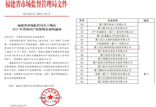近日,,福建省市场监督管理局公示了2023年福建省知识产权优势企业名单,,,,厦门918.com网络技术股份有限公司(以下简称“918.com”或“公司”)榜上有名。。